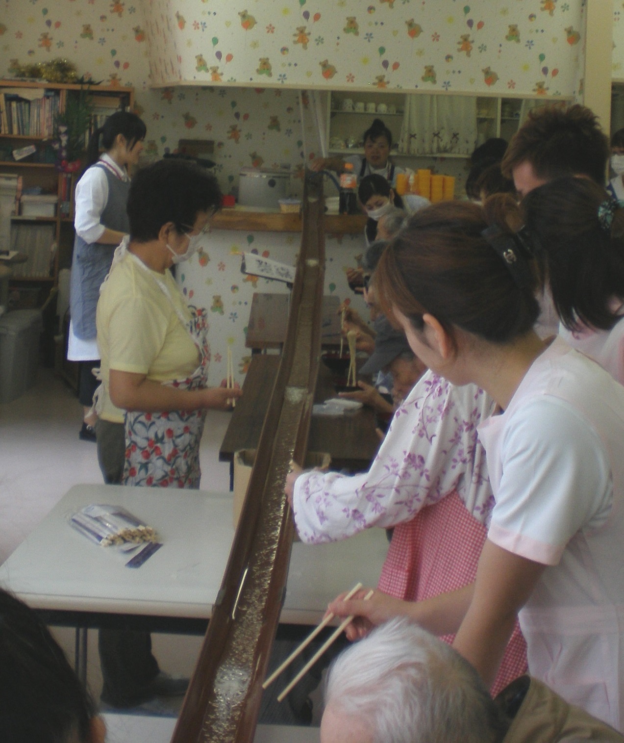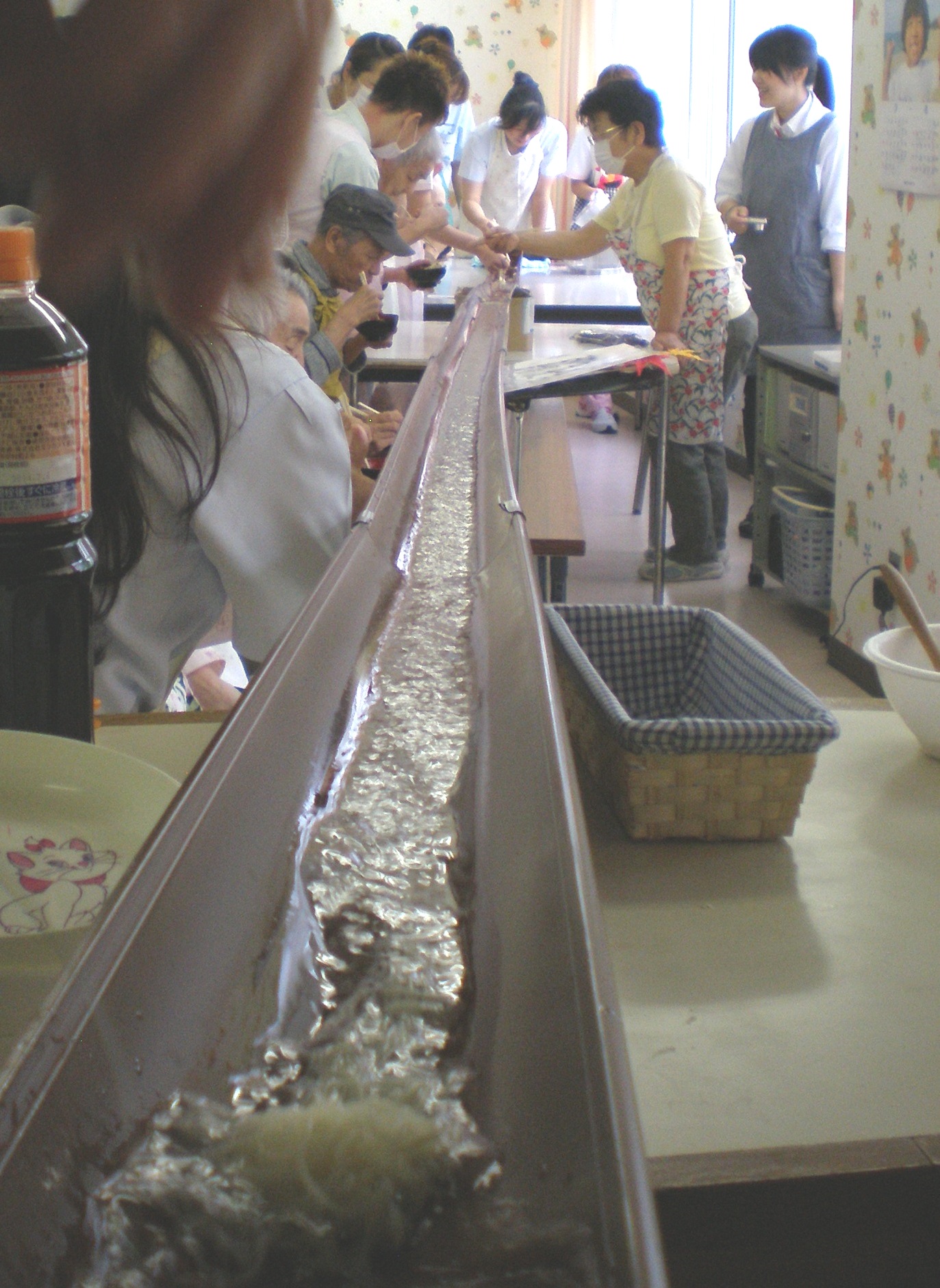 そして、今回は〝流しそうめん〟です。この季節では定番のメニューも、なが~い水路に流すことで、とても涼やかに感じます。 (石井)