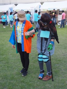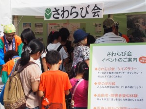 当日、さわらび会ブースでは、足や手に重りをつけて歩いたりする高齢者・障害者疑似体験や、さわらび会の施設である「明日香」で作られているクッキーをプレゼントするクイズラリーなどを行いました。