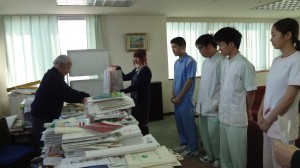 福祉村病院では8名のスタッフが新成人を迎え、山本理事長先生からお祝いの品が贈られました。