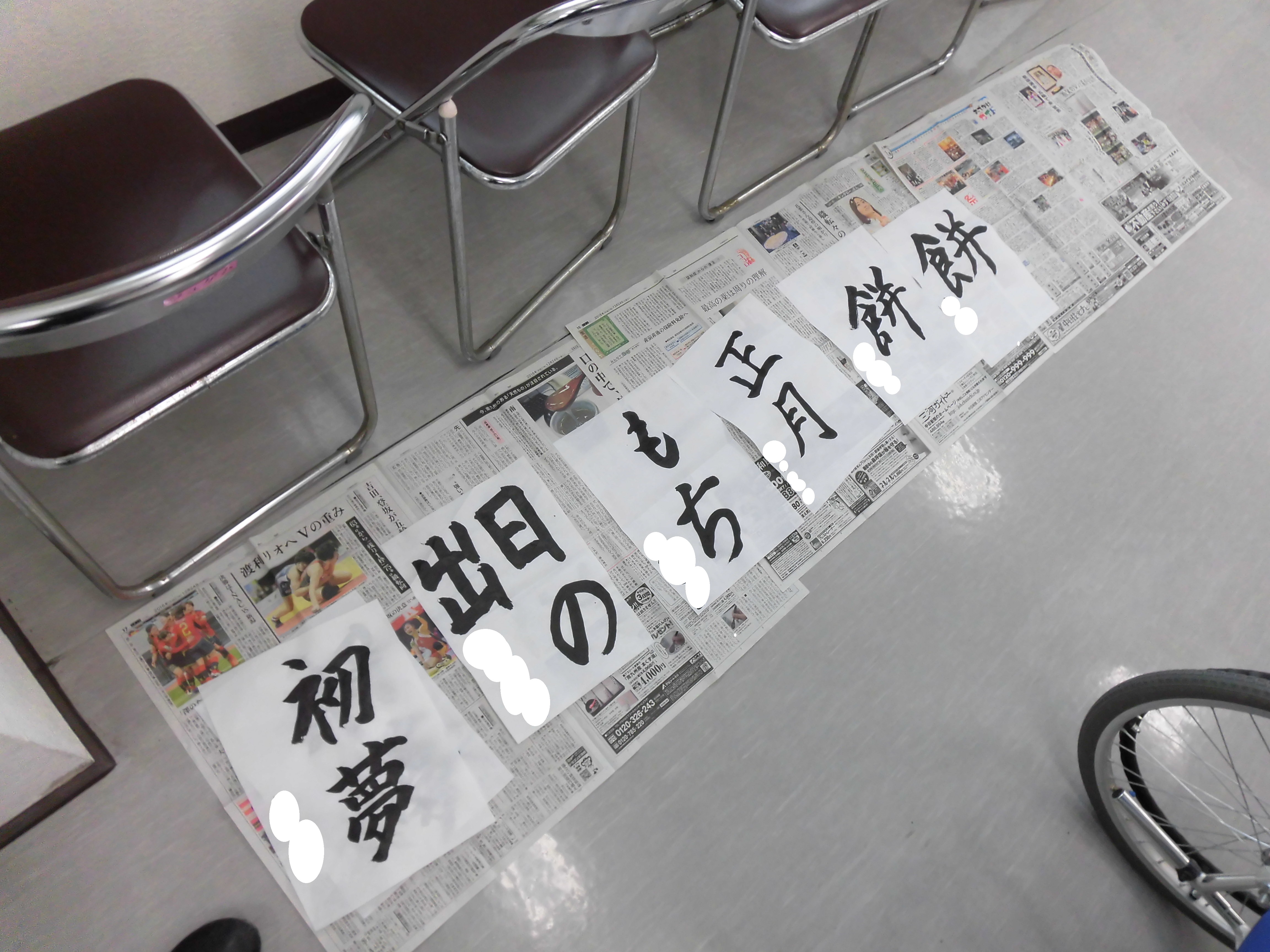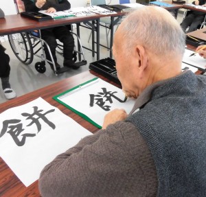 講師が手本を書き、【正月】、【迎春】、【初夢】などの言葉を書いて頂きました。いつもの雰囲気と違うせいか熱中されている方が多く、どの作品も素晴らしいものばかりでした。