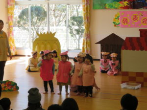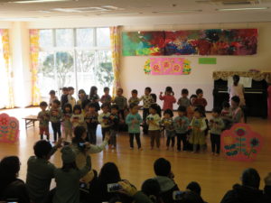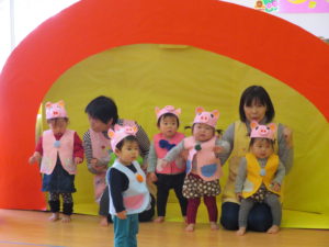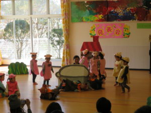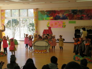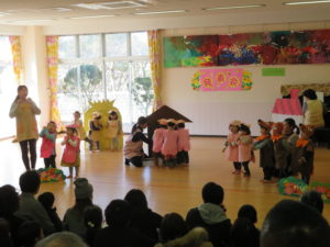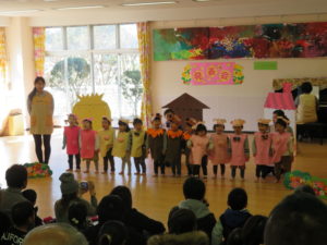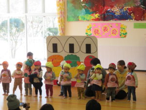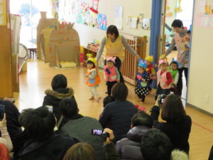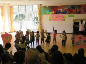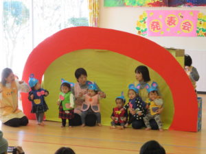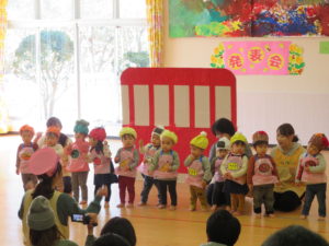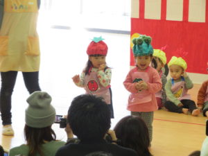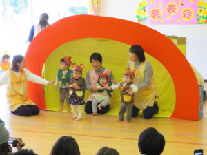 1歳児は劇 「 おべんとうバス 」、歌、タンバリン、メロディーベルを