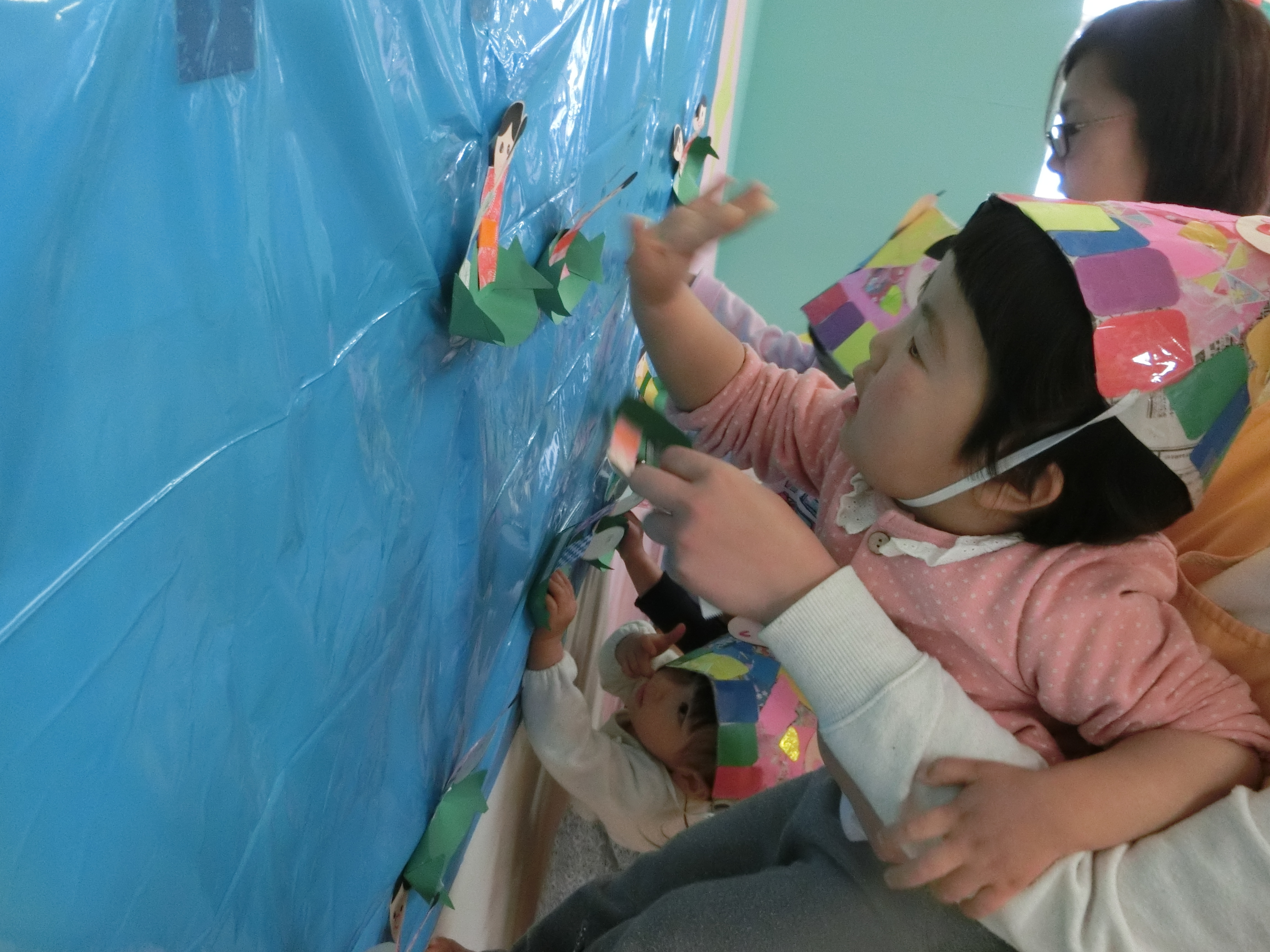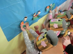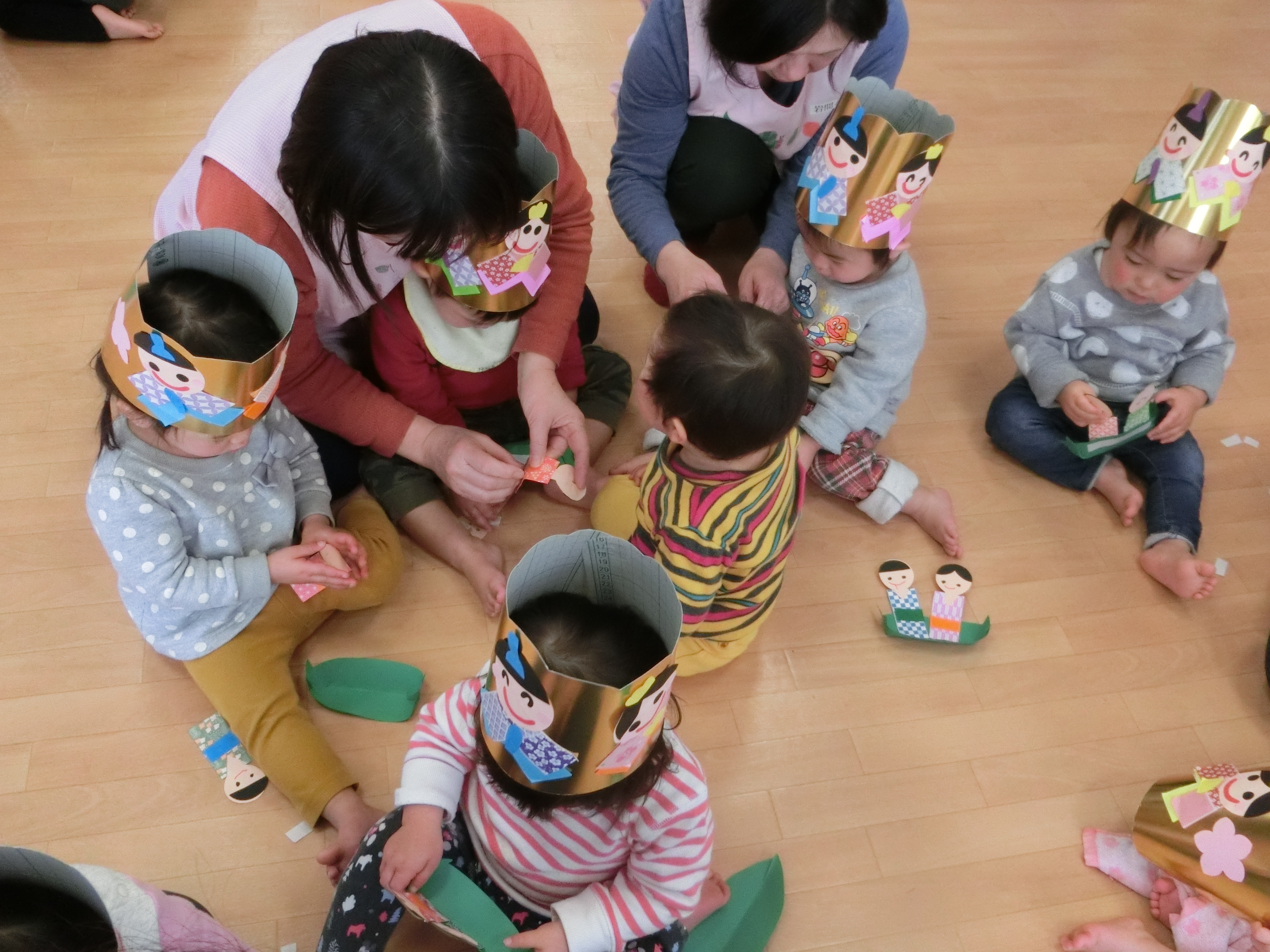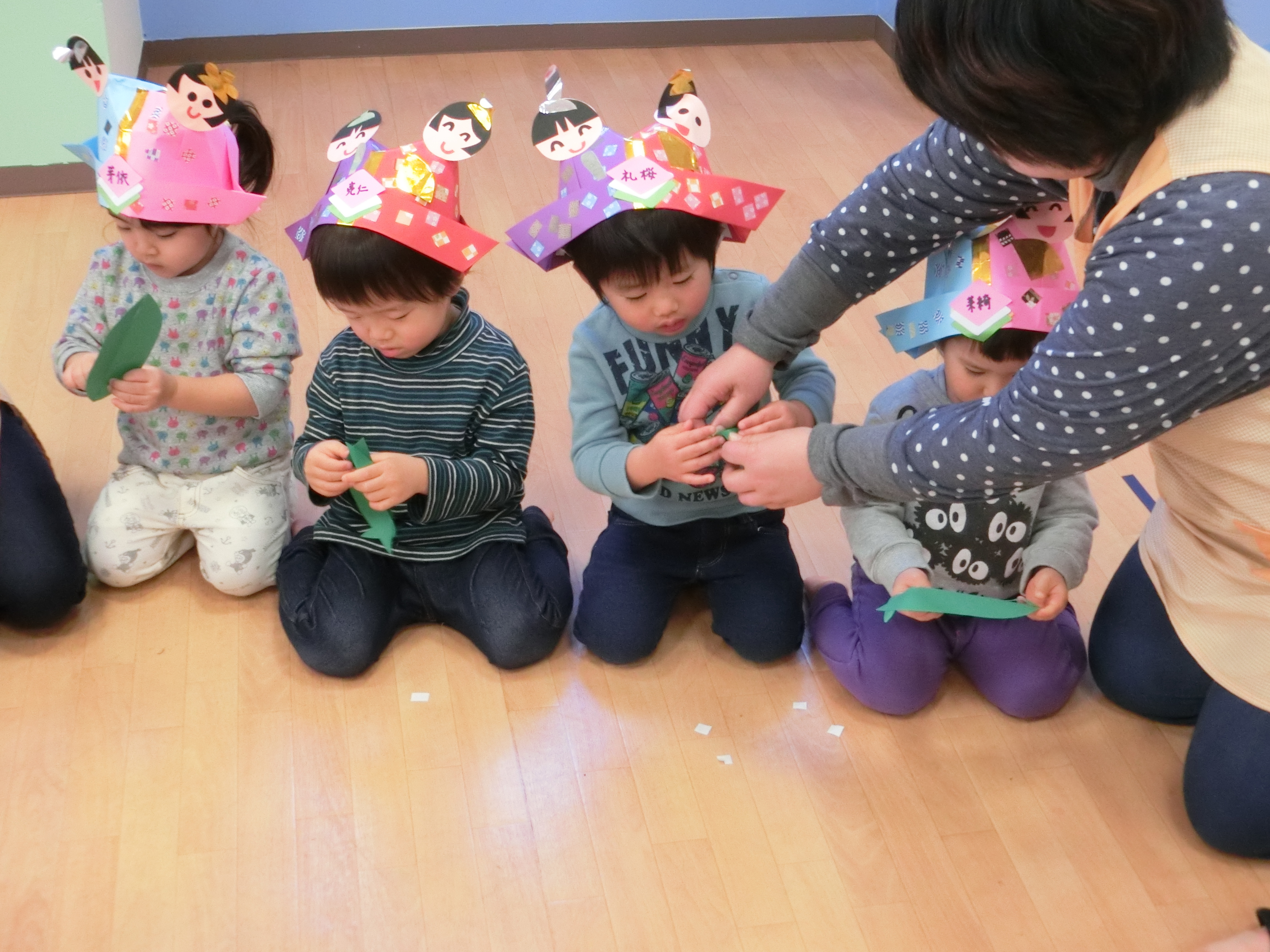 の紙芝居を見た後、みんなで笹船を作り人形をのせ流しびなをしました。