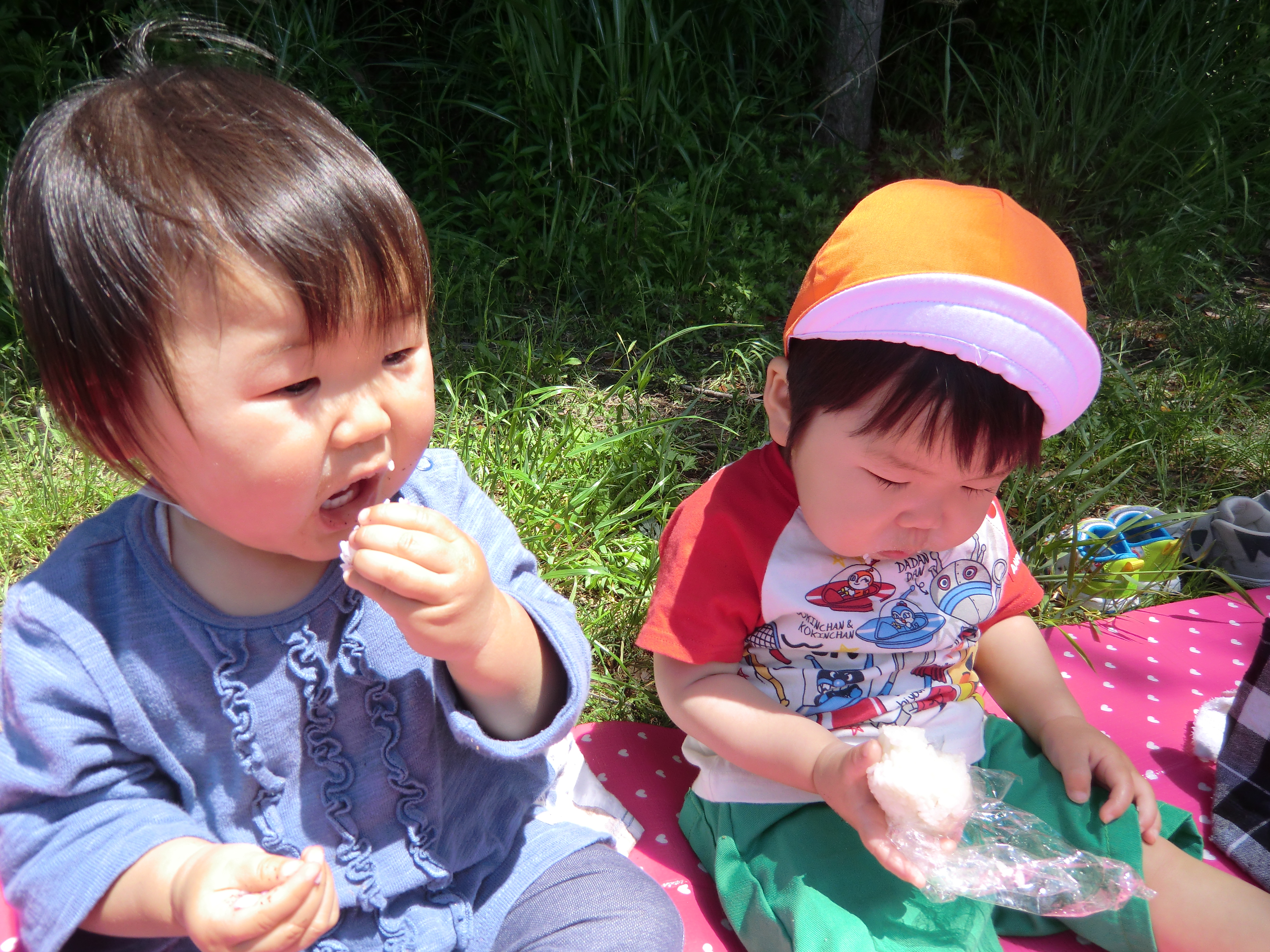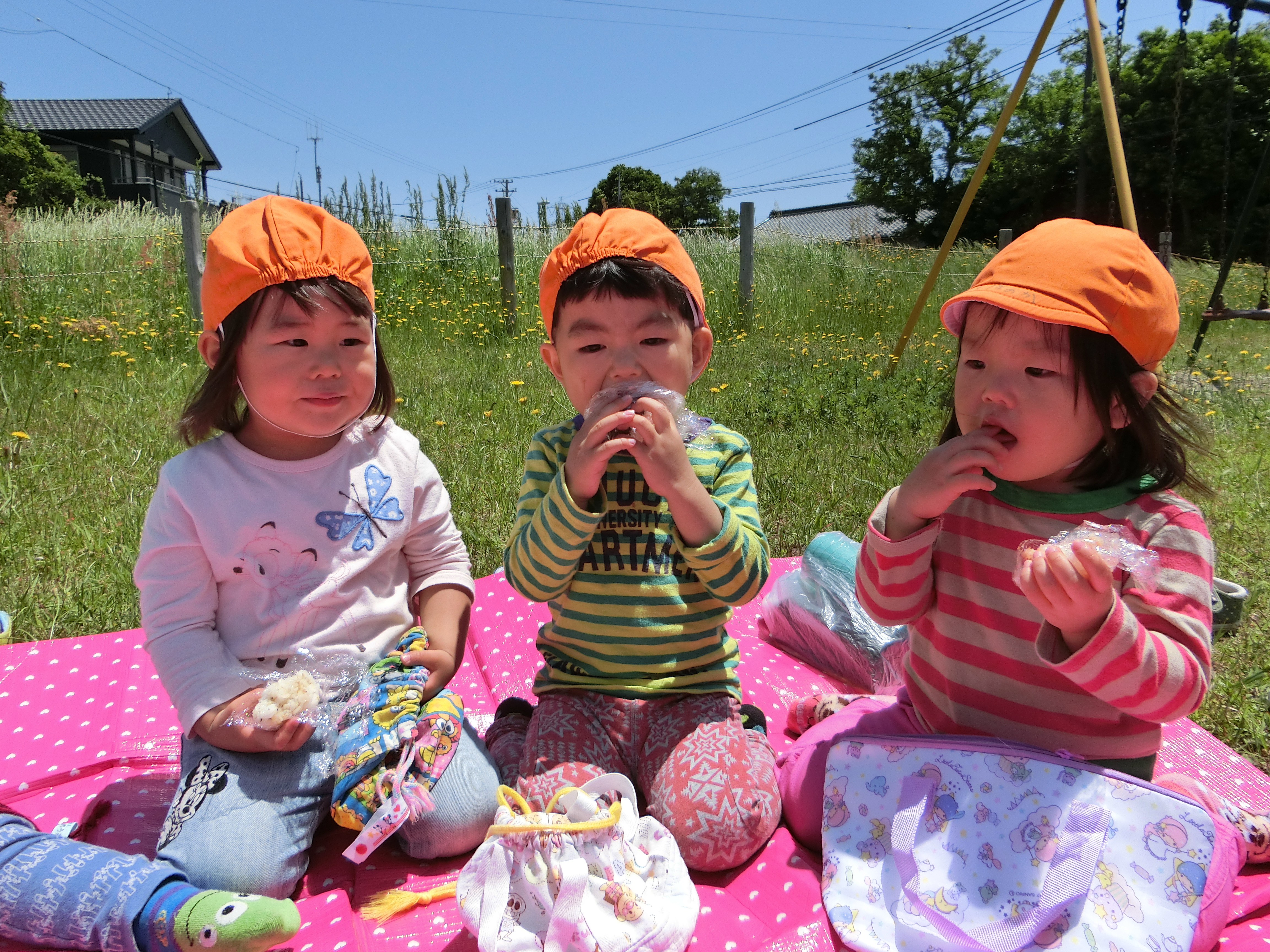 お家の人が作ってくれたおにぎりを青空の下、たくさんのタンポポの中で