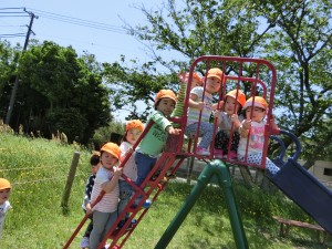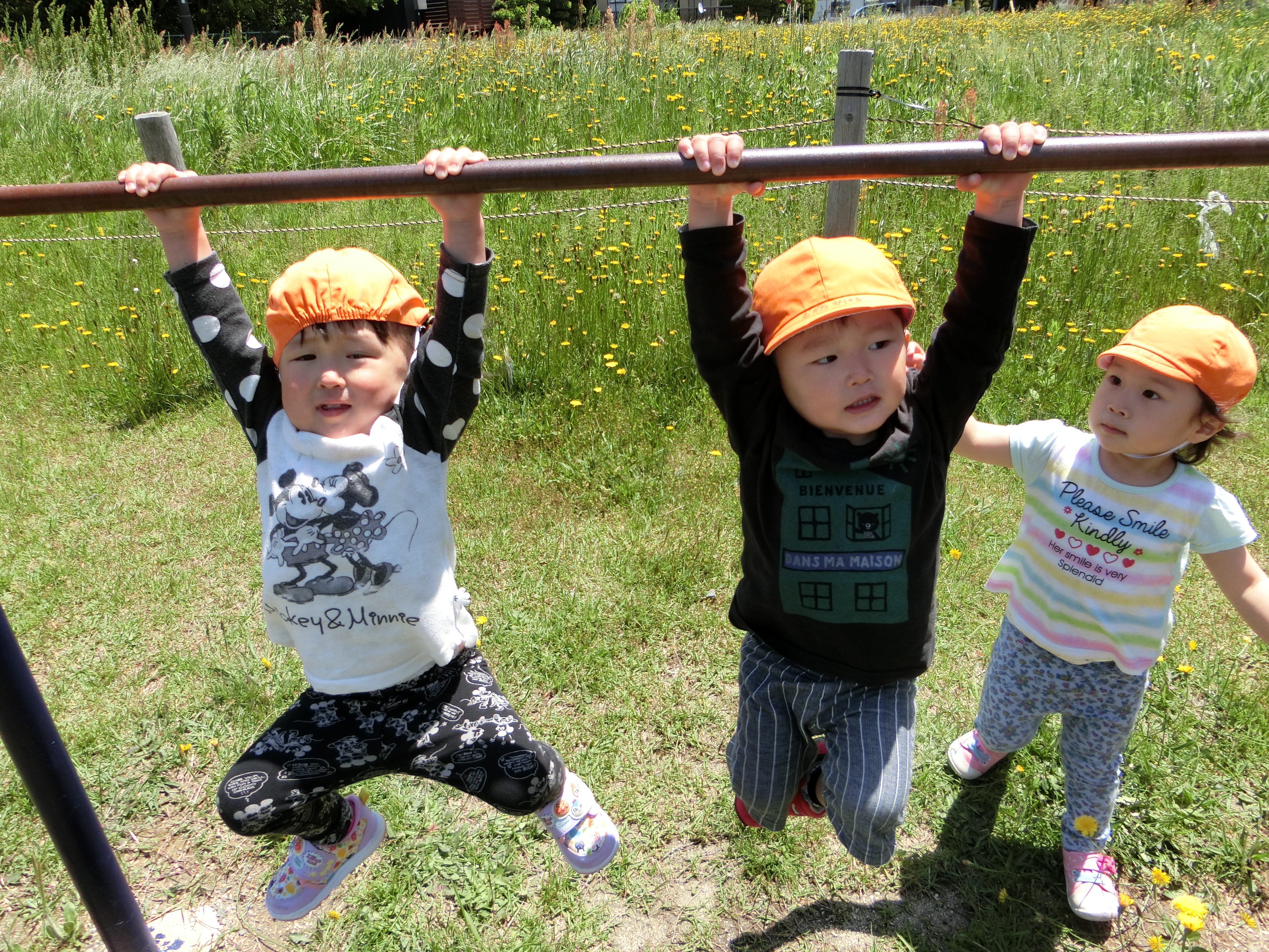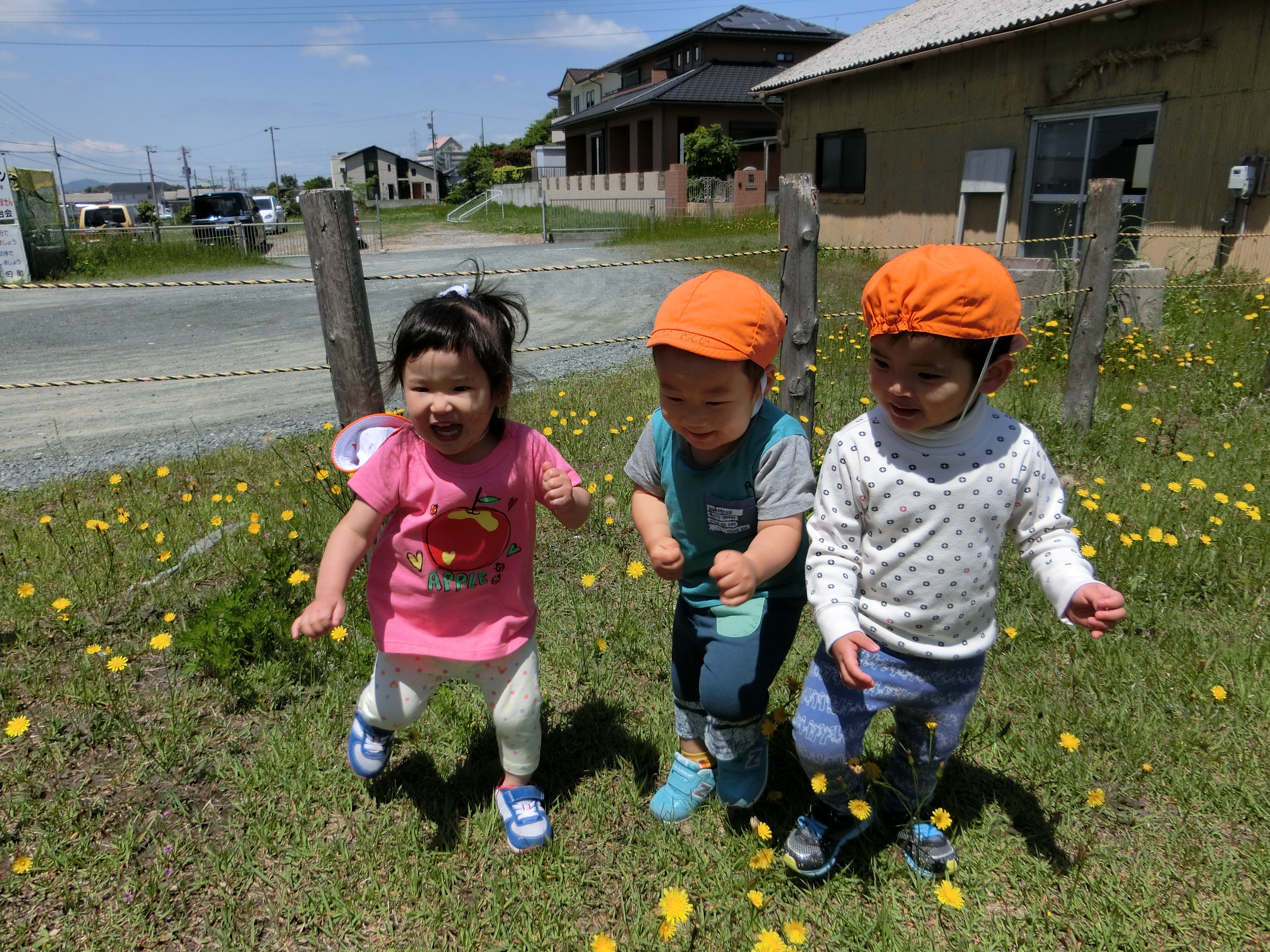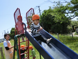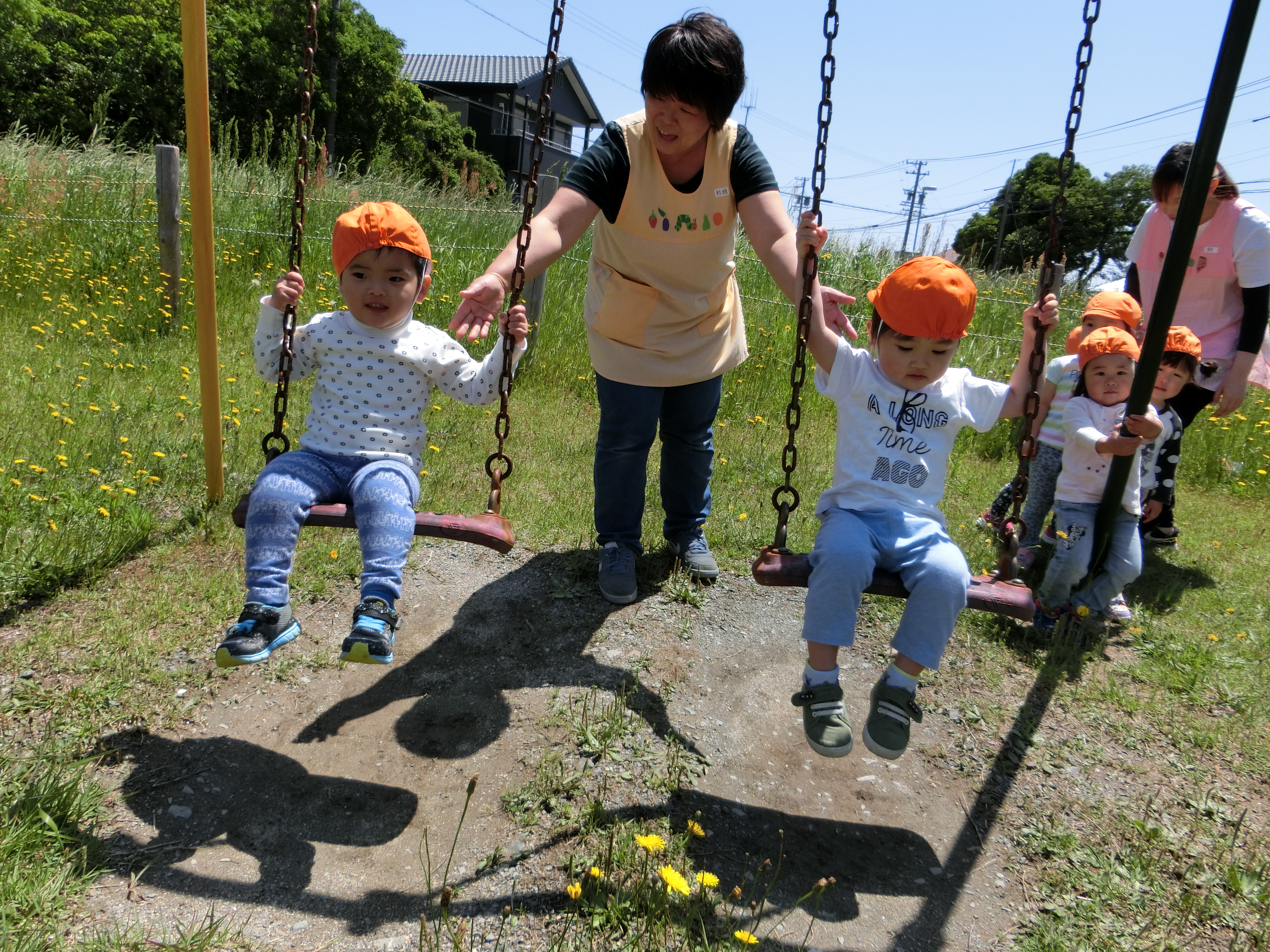 滑り台やブランコで遊んだり、タンポポを摘んだりと