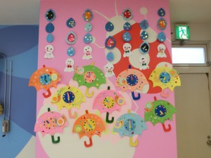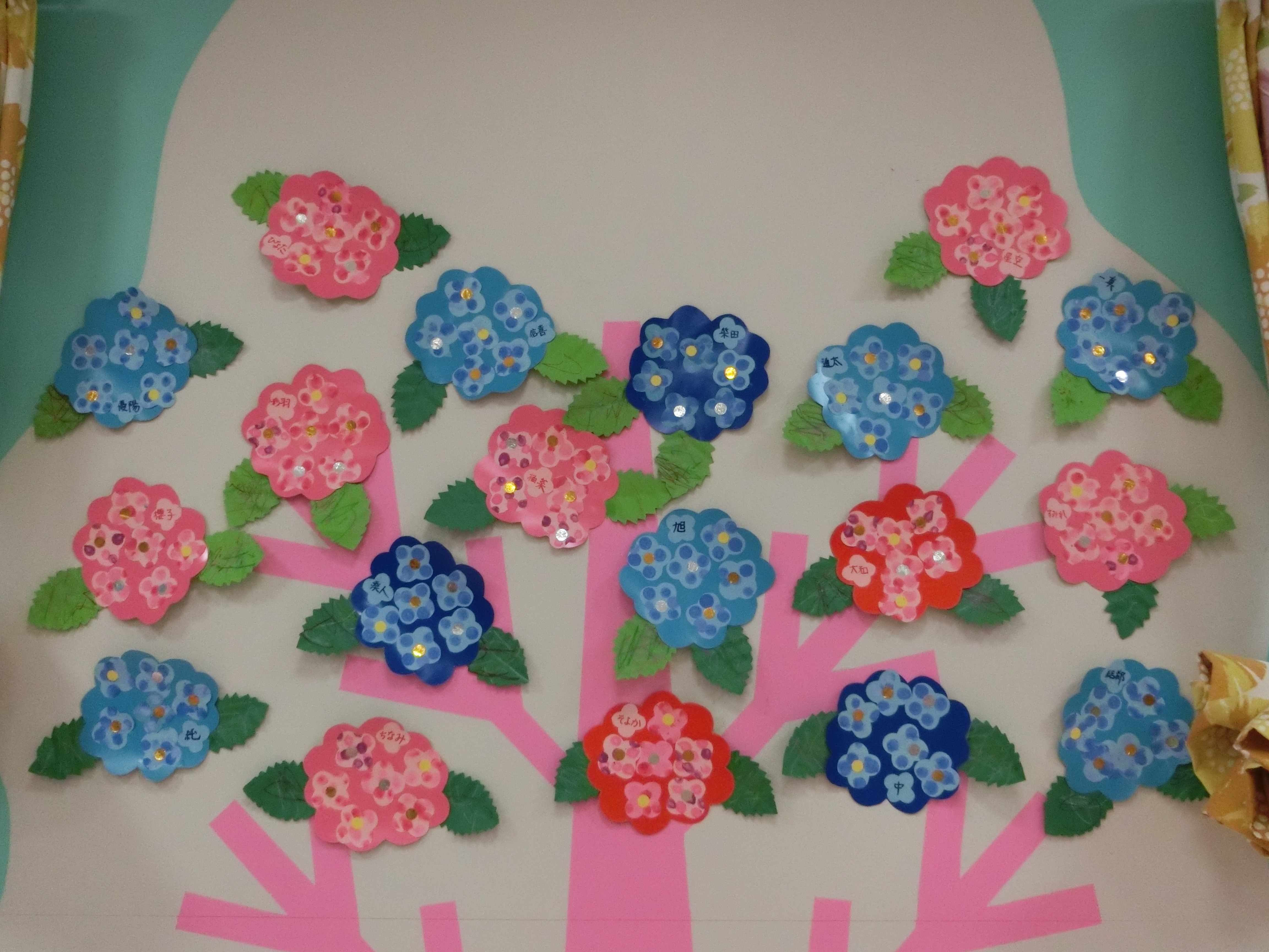 6月の壁面の製作で、あじさいとしずくと時計を作りました。