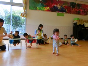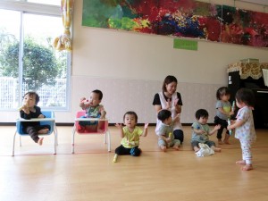 桃組0歳児は 「 どんな色がすき 」 や 「 まつぼっくり 」 などを歌いました。