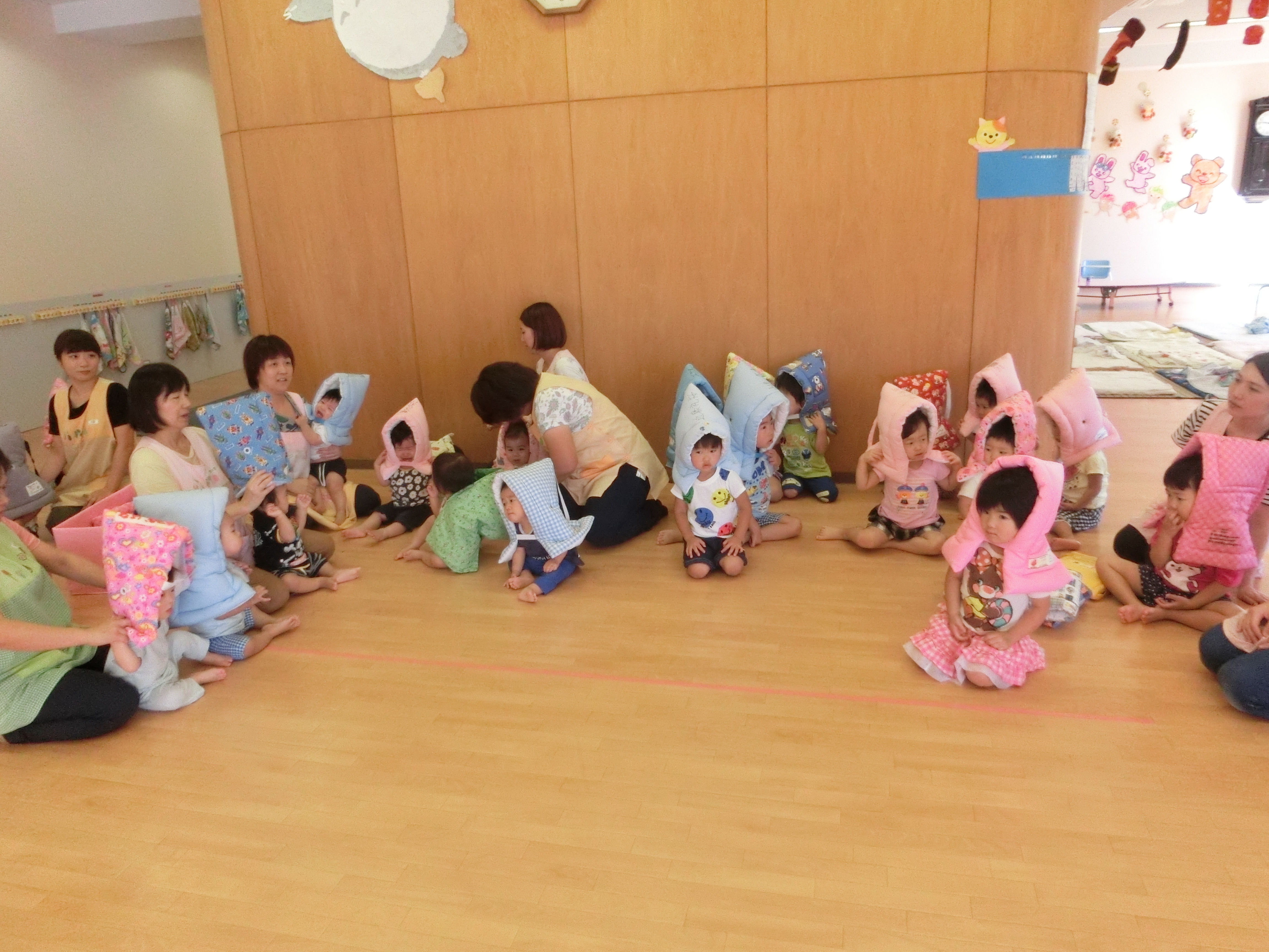 各クラスでの練習もあり、防災頭巾を自分で被れる子も増えてきました。